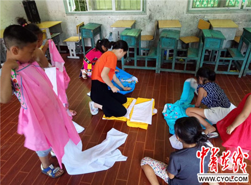大学生在教室给小朋友们表演湘剧《描容上路》片段