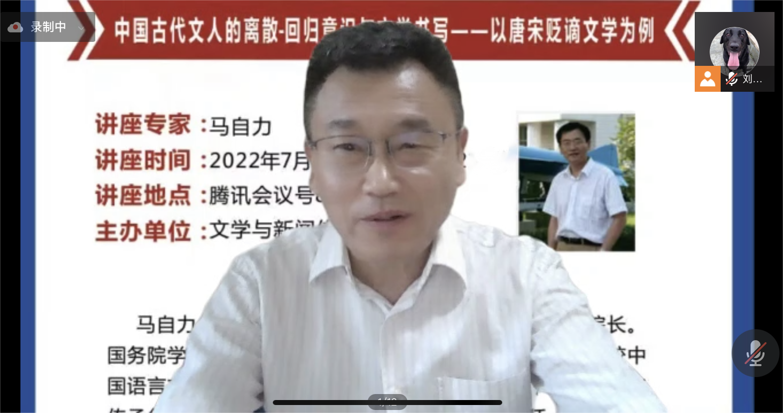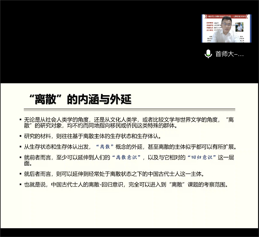 2022年7月7日晚,首都师范大学文学院院长、博士生导师、国务院学位委员会中文评议组成员马自力教授通过线上平台为文学与新闻传播学院师生作了题为“中国古代士人的离散-回归意识与文学书写”的学术讲座。近两百位师生参加了此次讲座,讲座由院长龙永干教授主持。