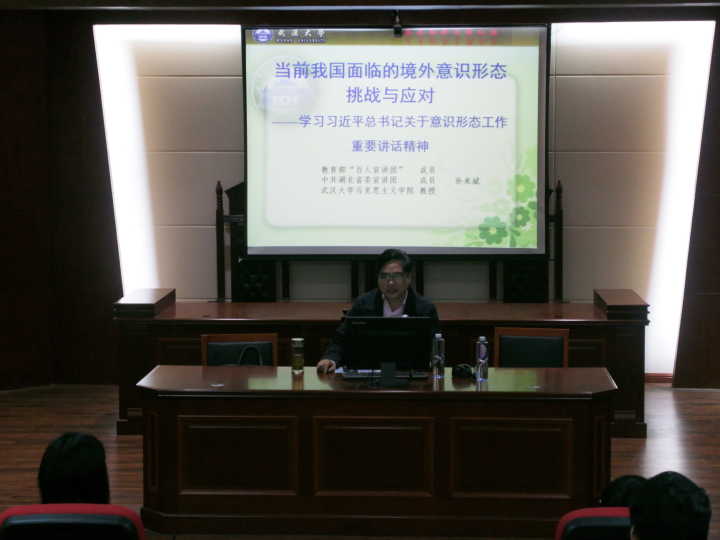 应beat365省德育学科研究基地、马克思主义学院邀请,4月26日,武汉大学珞珈特聘教授、博士生导师、马克思主义学院副院长、教育部“百人宣讲团”成员孙来斌教授来beat365讲座,主题是“当前我国面临的境外意识形态挑战与应对”。讲座由马克思主义学院院长周小李教授主持,beat365的湖南省德育学科研究基地研究成员、马克思主义学院师生、红色学坛成员等近200人聆听了讲座。