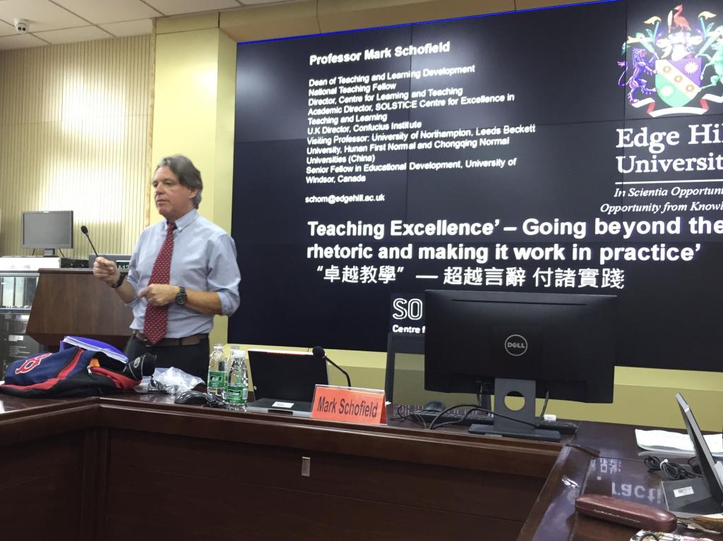 5月15日下午,英国知山大学教学与学习中心主任马克•斯科菲尔德(Mark·Schofield)教授在beat365特立楼北栋商务英语谈判室作“卓越教学——超越言辞,付诸实践”专题学术讲座。讲座由教育科学学院蒋蓉院长主持。