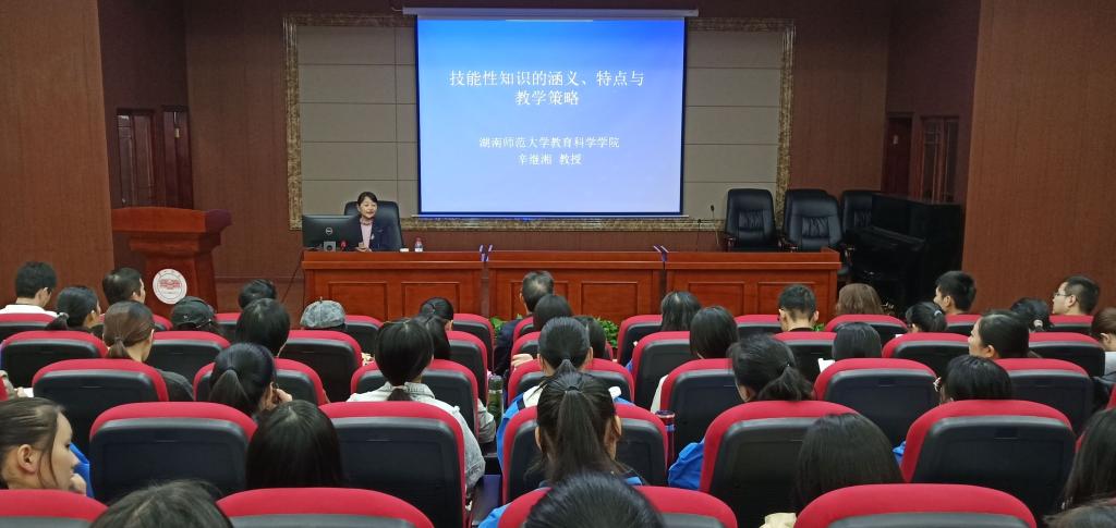 辛教授分别从技能性知识的涵义、特点以及教学策略三个方面进行阐述,提出掌握好技能性知识要从“做中学,学中思”,要了解技能型知识的身心体验性、情景依赖性、言意并存性、文化渗透性等特点。她指出掌握体验教学、情境教学、范例教学、对话教学是技能性知识的教学策略,并阐述了技能性知识教学与教师专业发展的关系,让现场师生深受启发。讲座后,张尚晏教授做了总结发言。