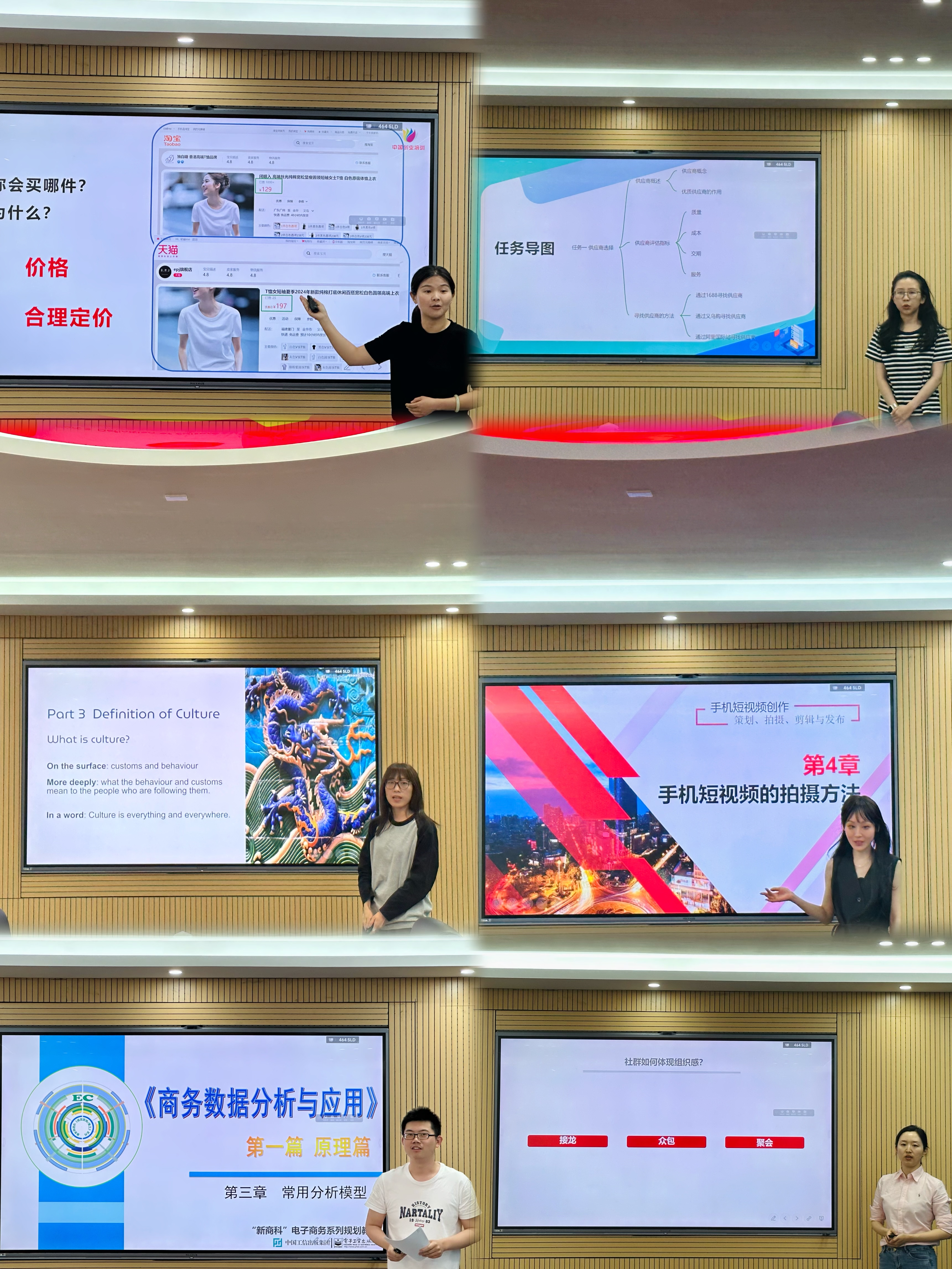 比赛中,青年教师们充分展现学科特色与教学智慧。陈青老师通过案例解析解释商品定价规则,引导学生思考如何合理定价;汪祯老师从学生学情出发,重难点突出,深入解读了跨境电商活动中供应商选择的规则和方法;杜渐老师通过模拟线下活动举办,指导学生从主题确认、活动策划、方案执行、人员邀请、现场调控、活动反思等方面完整的思考社群活动开展的流程;古清悠老师将“文化自信”的思政元素融入跨境电商文化与沟通,实现专业知识与职业素养的有机统一;彭乔老师从生活化的运用出发,利用案例讲解和实操相结合的教学方法,帮助学生理解短视频拍摄中景别的含义和运用;王昱文老师借助案例导入和图文并茂的可视化数据分析,解读直播电商产业经济环境数据背后的意义。参赛教师新颖的教学设计、扎实的专业功底和富有感染力的授课风格,充分体现了我院教师良好的专业素养和积极的精神风貌。