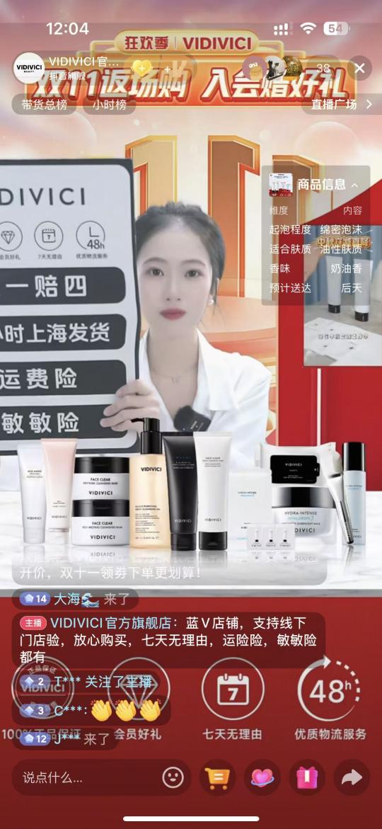 在“双十一”期间,多名学生首次在直播间亲身感受大促,从紧张到自信,从模仿到创新,不断磨练讲解技巧、镜头表现力和品牌表达能力。他们用真诚与专业赢得了客户喜爱,也让直播间充满年轻活力,成为品牌传播的新亮点。学生团队独立运营的VIDIVICI直播间,“双十一”当天营业额是平时的三倍,商品点击成交率从日常18%上升到25.15%,观看成交率从日常7%上升到9.82%。。