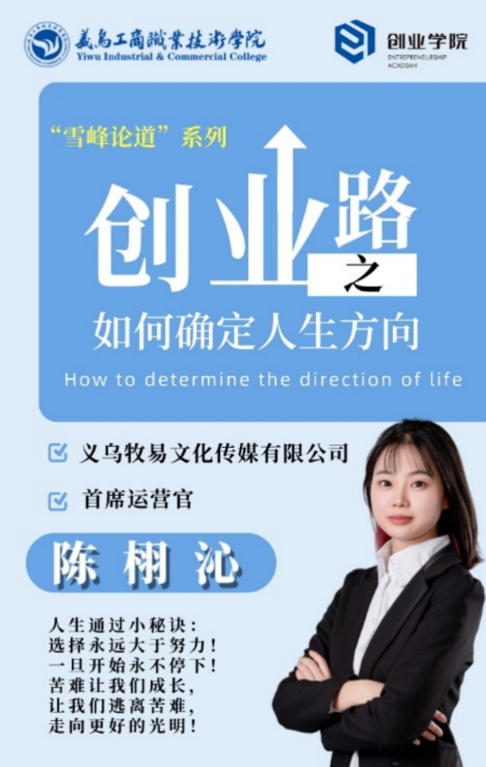10月23日下午,米乐mile官方网站邀请义乌牧易文化传媒有限公司首席运营官陈栩沁在雪峰报告厅为我院学生开展了“雪峰论道”系列讲座——创业路上之如何确定人生方向的讲座活动。