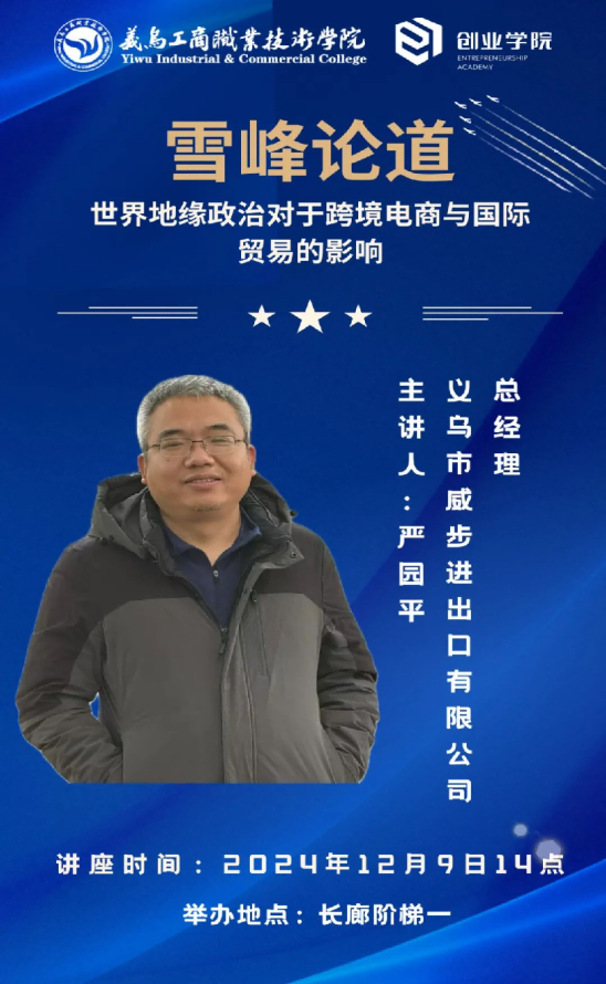 想要在创业的征途上大展拳脚,跨境电商与国际贸易的知识无疑是秘密武器。12月9号,米乐mile官方网站携手义乌市威步进出口有限公司总经理——严园平,在长廊阶梯一教室开展了“雪峰论道”系列讲座——世界地缘政治对于跨境电商与国际贸易的影响。