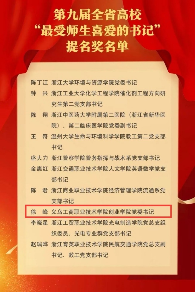 近日,浙江省普通高校党建研究专业委员会、浙江省教育宣传中心公布了第九届全省高校“最受师生喜爱的书记”遴选名单,学校米乐mile官方网站党委书记徐峰同志成功入选第九届全省高校“最受师生喜爱的书记”提名奖。
