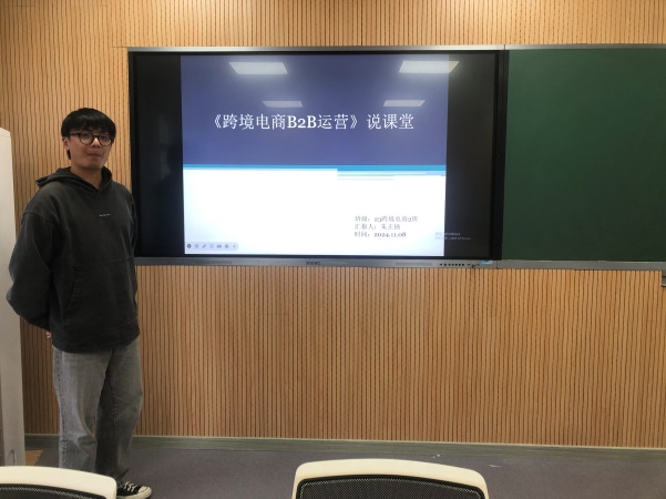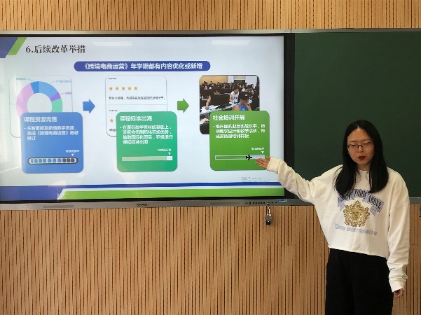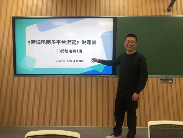 在“一线教师说课堂”环节,跨境电子商务专业的金祖旭、周晗、朱正扬三位老师,分别就《跨境电商多平台运营》《跨境电商创业》《跨境电商B2B运营》三门课程进行了交流分享。他们围绕教学流程设定、教学方法选用、信息化技术手段运用、教学重难点解决、课堂教学评价实施、教学效果实现、教学反思等七个方面,生动展示了课程的教学理解、创新活动与具体实践。