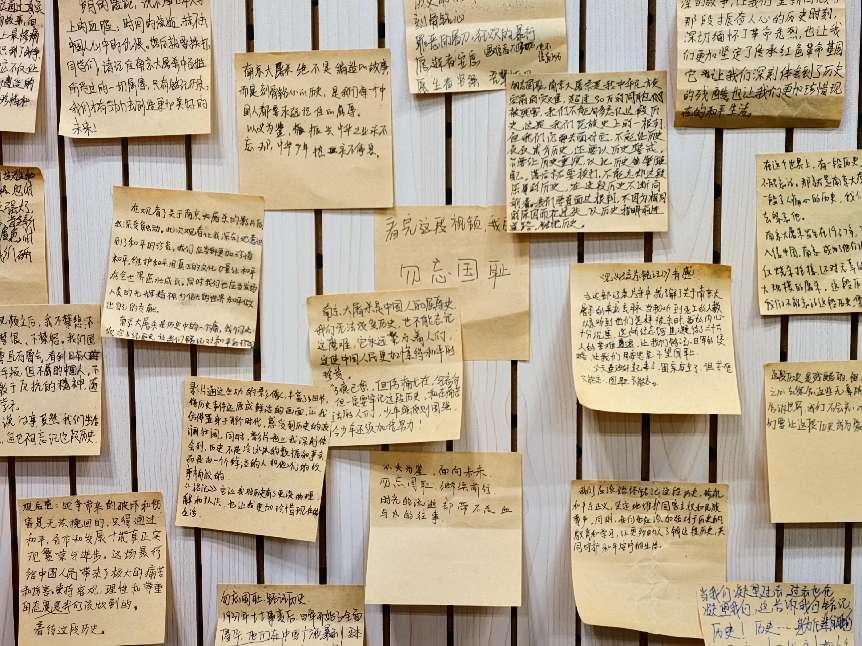 感念难抒,以笺承寄。参与活动的每一位青年学子都在便利贴上写下了个人感悟,把对死者的缅怀、对人生的期望、对先驱的感恩、对家国的承诺都浓缩在小小的便笺里,贴在留言墙上,叙臆明志。