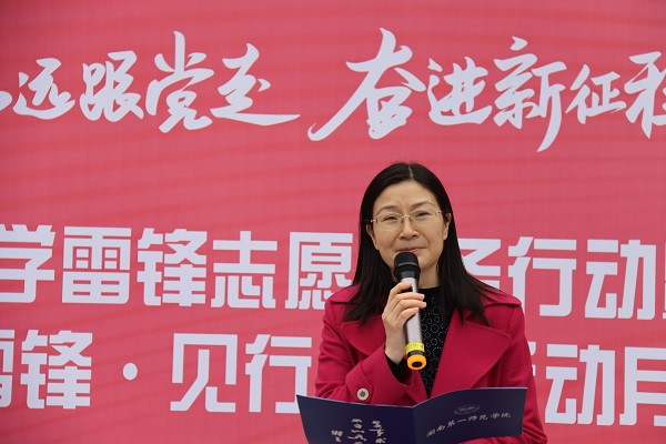 “雷锋精神是中华民族传统美德与共产主义思想结合的典范,它是中华民族绵延数千年不间断、世代发展、锤炼造就的民族意识之一,是今天在建设社会主义现代化过程中迎接各种挑战所须的民族自信心、自尊心的力量源泉。雷锋精神是一种不朽的象征,象征着中华民族勤劳、简朴、关爱、一心为公的优良传统,同时也成为了一种永恒的启示,启示我们大学生要奋发向上,为中华民族的繁荣昌盛奉献自己的青春。”蒋蓉在致辞中阐述了自己对新时代雷锋精神的理解。她向志愿者们提出了弘扬雷锋精神和发扬先辈优良传统的要求,并指导大家落实以下几点:一是用雷锋精神武装自己,立足一师,助人为乐学雷锋,勤俭节约学雷锋,锐意进取学雷锋;二是要用雷锋精神指导学习,立足大学,在学习上有恒心、有信心、有毅力,吃苦耐劳、勤奋钻研,用自己的知识武装头脑,用自己的知识报效祖国,用自己的知识实现人生价值;三是要把雷锋精神贯彻到实处,发扬勤勤恳恳、踏踏实实的优良作风,共同促进雷锋精神在校园内的传播,形成“处处讲文明,处处有奉献”的良好氛围,让校园中的善意更多,感动与温暖并存。