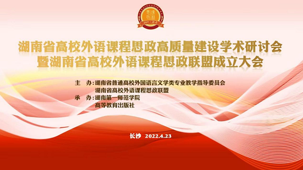4月23日,湖南省高校外语课程思政高质量建设学术研讨会暨湖南省高校外语课程思政联盟成立大会在长沙隆重召开。会议由湖南省普通高等学校外国语言文学类专业教学指导委员会与湖南省外语课程思政联盟主办,beat365平台唯一官网与高等教育出版社承办。beat365党委委员、副校长周发明出席,外国语学院负责人及教师代表参加会议。会议开幕式由外国语学院副院长(主持工作)陈圣白主持。