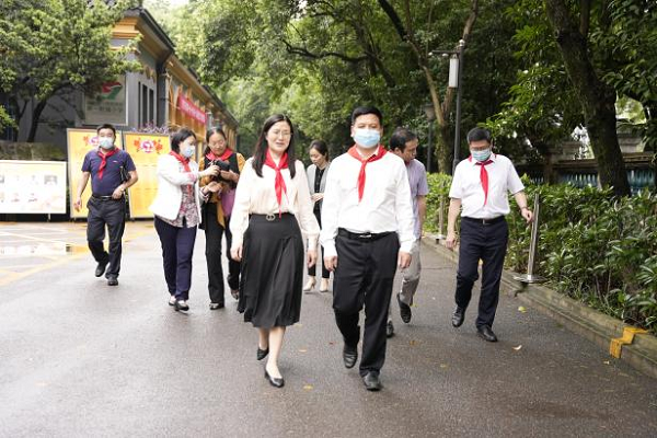 王玉清一行先后参观了一附小、二附小校园,详细了解了两所附小的办学特色、育人理念及校舍情况,满心关切附小师生的成长发展。随后,在少先队员的邀请下,慰问团队出席了一附小在礼堂举行的2021级一年级首批新队员入队仪式,王玉清、黄智勇、蒋蓉、曾晓洁登台为一年级新成立的四个中队授中队旗,并为辅导员颁发了聘书。在二附小,一行人走进六一文艺汇演现场,观看了孩子们的演出。舞台上,孩子们扮演的憨态可掬的小企鹅和阳光自信的小星星形象,给领导们留下来深刻印象。王玉清高度肯定了孩子们的精彩表现,同时鼓励小朋友们继承学校优良传统,让红色火种生生不息,代代相传。