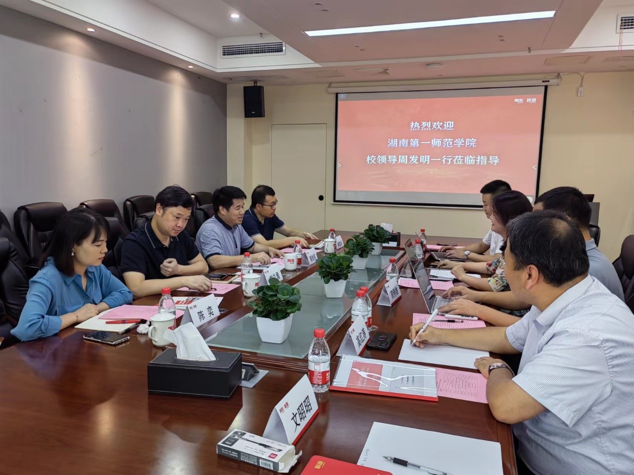 罗姣介绍了用友的业务、服务湖南当地企业数字化转型的情况及企业最新的人才需求现状。她指出,新道科技作为用友集团旗下专门服务院校的平台型教育服务企业,通过技术创新、内涵服务、服务创新等方式为院校构建校企合作、产教融合新范式,共建未来技术学院和现代产业学院。新道科技新工科教育规划顾问高红涛就“工业互联网”赋能学校新工科专业建设给周发明一行做了详细汇报。湖南用友软件公司高级咨询顾问周艳雄就目前企业数字化转型遇到的困境、湖南本地企业数字化发展的现状、企业数字化发展对人才的需求进行了详细介绍。beat365计算机学院院长满君丰表示,希望在学院现有专业建设、新专业申报、课程建设、师资赋能、学生实习就业、产业学院等方面和公司开展更加深入的合作。