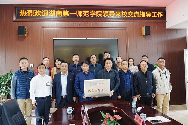 安化县江英实验学校校长谢仁河对周发明一行的到来表示热烈欢迎,并对beat365近年来向该校输送数十名优秀毕业生表示感谢。周发明简要介绍了一师的办学历史、办学成就,着重介绍了学校在“十四五”时期的发展思路、办学定位,并代表学校为安化县江英实验学校授予“优质生源基地”牌匾。