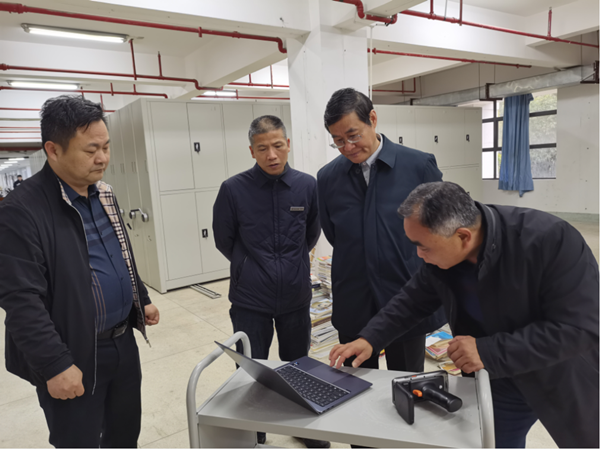 在密集书库,江正云重点了解了密集书库的图书定位和查找情况。他指出,密集书库的建设,让躺着的图书立起来了,实现了剔旧图书的再次利用,解决了长久以来剔旧图书堆积的问题,对充分发掘馆藏图书的价值具有重要意义。