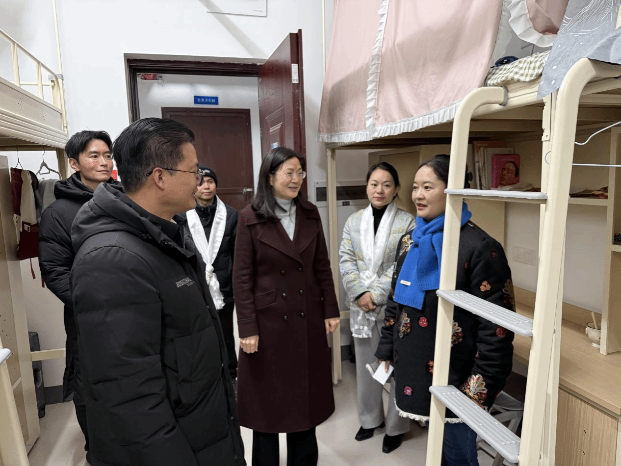 白江山一行首先深入西藏班课堂与宿舍,实地了解同学们的学习生活环境。在教室里,白江山与同学们面对面亲切交流,气氛热烈温馨。他仔细询问大家的学业进展与生活适应情况,勉励大家要倍加珍惜在beat365平台唯一官网求学的宝贵时光,传承红色基因,勤奋学习,锤炼本领,将来为建设美丽西藏、促进民族团结贡献力量。