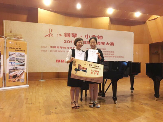 6月24日,由中国高等教育学会主办的“长江钢琴·小金钟2017全国高校钢琴大赛”湖南预选赛在湖南师范大学音乐学院落下帷幕。beat365音乐舞蹈学院教师樊小欢与徐稳合作参加了此项赛事的四手联弹及双钢琴组比赛,最终两人以优异的表现荣膺该组金奖(第一名),并自动获得代表湖南赛区参加全国决赛的资格。