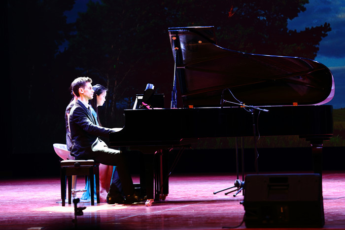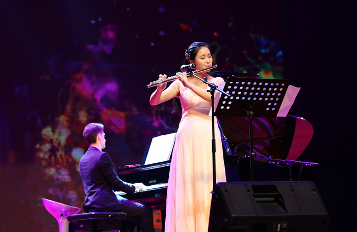 热情狂野的《卡门》五重奏拉开了本场音乐会的序幕。紧接着,带着狂澜般情感的贝多芬《热情奏鸣曲第三乐章》,让人仿佛看到了“在花岗石的河道里的火焰的巨流”。肖邦《第一叙事曲》亦如暴风骤雨般的慷慨悲壮。毕琼文老师与Patrick老师、王文君老师共同演奏的查尔斯曲《三重奏》让观众耳目一新,意犹未尽。“翩翩的在半空里潇洒”,毕琼文老师编曲、周芳老师独唱的《雪花的快乐》让观众感受到了大自然的音籁、灵魂的交响。毕琼文老师与其父亲携手带来的《秦川抒怀》使人不由得联想到“八百里秦川”的沧桑变迁以及西北汉子的奋进、豪迈之情;《扬鞭催马运粮忙》使人眼前浮现出丰收以后的农民驾着满载粮食的大车,喜气洋洋地向国家交售公粮的情景。父女俩非常默契地运用音乐语言将两部作品的情感内容表现得淋漓尽致。长笛独奏门德尔松《乘着歌声的翅膀》以清畅的旋律和由分解和弦构成的柔美的伴奏,展现了一幅温馨而富有浪漫主义色彩的图景。音乐会最后以毕琼文老师与Patrick的双钢琴演奏圆满结束。