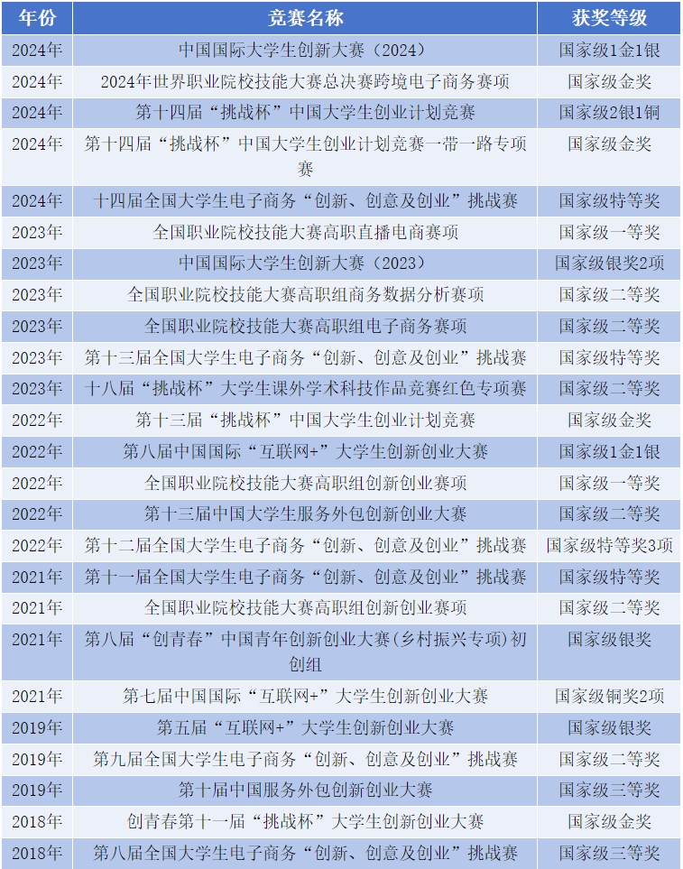 打造创业者的摇篮。学院以实践为平台,构建了创业班、创业精英班、青创空间、专创工作室、校外实训基地五大育人载体,建设了拥有12800平方米的创业孵化基地,现有专创工作室、教师工作站、青创中心、义台青年交流中心等30余个创业实践基地,形成了集教学、创业孵化等的一站式服务体系。2022年,创业园入选为国家级众创空间。学院以竞赛为抓手,以赛促创、赛创融合,学生竞赛成果丰硕,近五年,获得省赛各类奖项110余项,国赛奖项20余项。2024年学院获中国国际大学生创新大赛(2024)金奖、银奖各1项,世界职业院校技能大赛总决赛跨境电子商务赛项金奖1项。学院近90%学生投身创新创业实践活动,为区域经济发展输送了源源不断的电商技能人才和双创人才。
